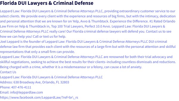 Leppard Law: Florida DUI Lawyers & Criminal Defense Attorneys PLLC, providing extraordinary customer service to our select clients. We provide every client with the experience and resources of big firms, but with the intimacy, dedication and personal attention that we are known for on Yelp, Avvo & Thumbtack. Experience the Difference. #1 Rated Orlando Law Firm on Yelp & Thumbtack in, Top 100 Trial Lawyers, Perfect 10.0 Avvo. Leppard Law: Florida DUI Lawyers & Criminal Defense Attorneys PLLC really care! Our Florida criminal defense lawyers will defend you. Contact us to see how we can help you! Call or text us for help. Joel Leppard is the founder of Leppard Law: Florida DUI Lawyers & Criminal Defense Attorneys PLLC DUI criminal defense law firm that provides each client with the resources of a large firm but with the personal attention and skillful representations that only a small firm can provide. Leppard Law: Florida DUI Lawyers & Criminal Defense Attorneys PLLC are renowned for both their trial advocacy and skillful negotiations, seeking to achieve the best results for their clients–including countless dismissals and reductions. Being charged with a crime, whether it is a misdemeanour or a felony, can cause a lot of anxiety. Contact Us Leppard Law: Florida DUI Lawyers & Criminal Defense Attorneys PLLC Address: 638 Broadway Ave, Orlando, FL 32803 Phone: 407-476-4111 Email: info@leppardlaw.com https://www.facebook.com/LeppardLaw/?ref=br\_rs