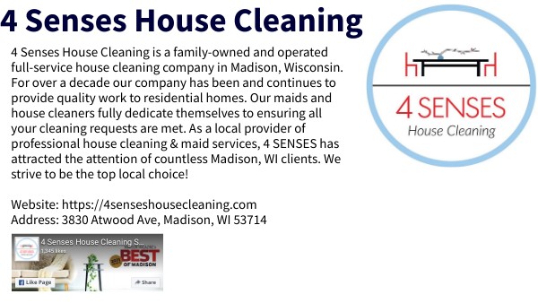 Looking for a move-in or move-out cleaning service in the Madison area? 4 Senses House Cleaning is ready to exceed your expectations with unbeatable results. Each of our cleaners is highly trained and fully vetted for your peace of mind. Not to mention, we offer transparent, flat-rate pricing. Website: https://4senseshousecleaning.com Address: Madison, WI 53714