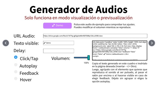 Copia el texto generado en este cuadro e insértalo en la página deseada (Insertar - </> Otro). Luego, agrúpalo con el elemento que quieras que reproduzca el sonido al ser pulsado, al pasar el ratón por encima o al hacerse visible en caso de elegir feedback. Déjalo sin agrupar si eliges la opción autoplay.