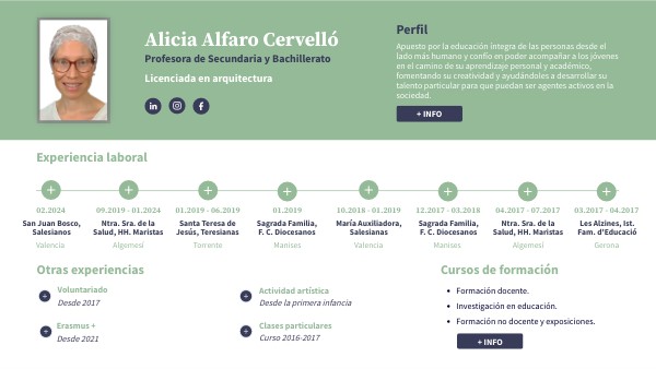 Apuesto por la educación íntegra de las personas desde el lado más humano y confío en poder acompañar a los jóvenes en el camino de su aprendizaje personal y académico, fomentando su creatividad y ayudándoles a desarrollar su talento particular para que puedan ser agentes activos en la sociedad.