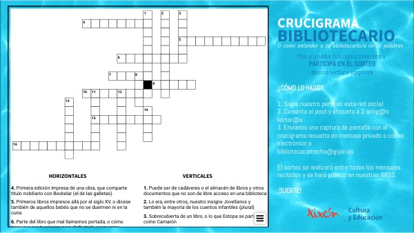 ¿CÓMO LO HAGO? 1. Sígue nuestro perfil en esta red social 2. Coménta el post y etiqueta a 2 amig@s lector@s 3. Envíanos una captura de pantalla con el crucigrama resuelto en mensaje privado o correo electrónico a bibliotecacamocha@gijon.es El sorteo se realizará entre todos los mensajes recibidos y se hará público en nuestras RRSS. ¡SUERTE!