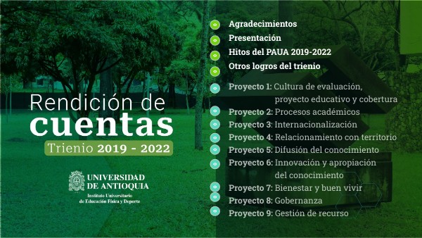 El Instituto Universitario de Educación Física y Deporte (IUEFD) de la Universidad de Antioquia, de conformidad con la Ley 1474 (Art.78) de 2011, asume el compromiso de rendición de cuentas como un espacio de interlocución entre la administración y su comunidad académica, orientado a generar condiciones de confianza y transparencia y de garantizar el ejercicio del control social a la administración