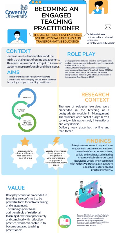 Role play scenarios embedded in teaching are confirmed to be powerful tools for active learning and engagement. The findings point to an additional role of relational learning if crafted appropriately and combined with reflective practice, which can enable us to become engaged teaching practitioners.