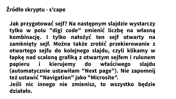Jak przygotować sejf? Na następnym slajdzie wystarczy tylko w polu "digi code" zmienić liczbę na własną kombinację. I tylko nałożyć ten sejf otwarty na zamknięty sejf. Można także zrobić przekierowanie z otwartego sejfu do kolejnego slajdu, czyli klikamy w łapkę nad scaloną grafiką z otwartym sejfem i rulonem papieru i kierujemy do właściwego slajdu (automatycznie ustawiłam "Next page"). Nie zapomnij też ustawić "Navigation" jako "Microsite". Jeśli nic innego nie zmienisz, to wszystko będzie działało.