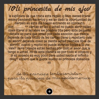 le explicare de que trata este regalo q llevo meses literal meses pensando hacerlos y me an dado la oportunidad de dárselo en este día bueno entrando en contexto son.............. ** cartas en las q usted no puede abrir todas ósea literal si las abre me pondria tite pero este pequeño detalle es para que usted por cada emoción que sienta, depende de cada titulo de las cartas tiene q repetarlo vale mi amor? depende como se sienta usted siéntase libre de abrirlo, vuelvo y repito no puede abrirlas todas a la vez vale? seria trampa están hechas por todo el amor que le tengo a usted, no de este planeta es por todo el cosmos y si es cosmos es muy poco para usted hasta el infinito okey? espero que le guste mucho mi princesa domenica👑