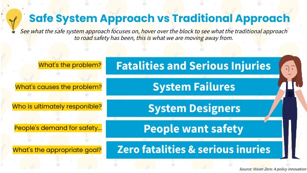 See what the safe system approach focuses on, hover over the block to see what the traditional approach to road safety has been, this is what we are moving away from.