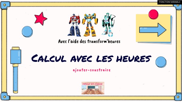 Je suis un transform'heure fait glisser des jetons sur moi pour faire des conversions simples. Avec le jeton une heure tu recevras un jeton 60 minutes. Avec un jeton de 60 minutes , tu recevras un jeton 1 heure