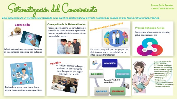 Entonces Sistemarización Enfatiza el polo del conocimiento, pero siempre hablando del conocimiento práctico. Lo que se pretende es enriquecerlo, en diálogo con los enfoques teóricos vigentes y mediante un proceso ordenado y consciente de descubrimiento y explicitación de los procesos y productos de conocimiento presentes en la práctica