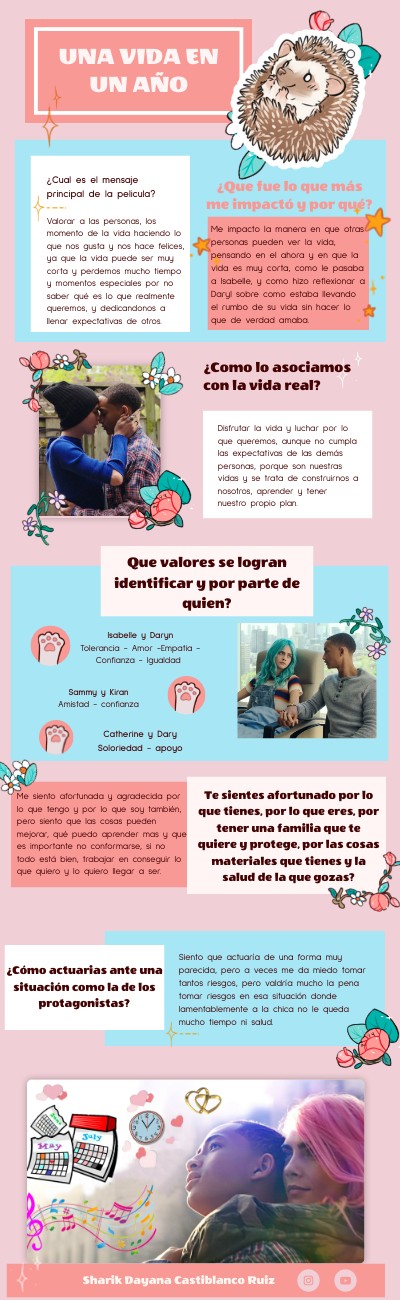 Valorar a las personas, los momento de la vida haciendo lo que nos gusta y nos hace felices, ya que la vida puede ser muy corta y perdemos mucho tiempo y momentos especiales por no saber qué es lo que realmente queremos, y dedicandonos a llenar expectativas de otros.