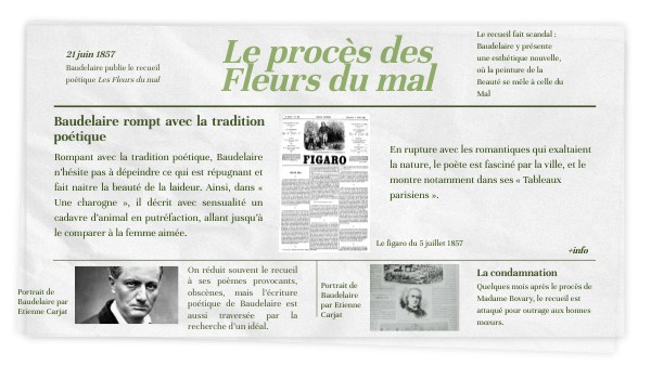 Le recueil fait scandal : Baudelaire y présente une esthétique nouvelle, où la peinture de la Beauté se mêle à celle du Mal