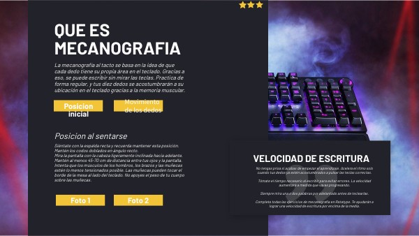 La mecanografía al tacto se basa en la idea de que cada dedo tiene su propia área en el teclado. Gracias a eso, se puede escribir sin mirar las teclas. Practica de forma regular, y tus diez dedos se acostumbrarán a su ubicación en el teclado gracias a la memoria muscular.