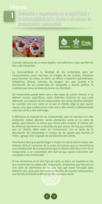 Cuando hablamos de un texto legible, nos referimos a que sea fácil de leer y de interpretar. La lecturabilidad es la facultad de los contenidos para ser comprendidos como mensaje, al margen de los medios utilizados para expresar las ideas, es decir, se refiere a aspectos gramaticales, sintácticos, léxicos, icónicos, de imagen, etc. que ayudan a la asimilación de los contenidos en tipografía y diseño gráfico, la cualidad que tiene un texto de leerse con facilidad. Un restaurante puede tener uno o dos tipos de cartas (menú), si se definen menús específicos, estos deberían incluirse en una carta diferente. La mayoría de los restaurantes con varias estrellas Michelin no cuentan con una carta en la que el cliente elige lo que quiere comer, sino que confeccionan solo uno o dos menús, habitualmente uno más corto y otro más largo. A diferencia la mayoría de los restaurantes, que no cuentan con esta distinción, deben atender varios elementos como en la carta de platos, para diseñar su menú que ofrece para orientar al cliente con las diversas opciones en la decisión de que comer. No hay que olvidar que un diseño debe estar en consonancia con el resto de la decoración del restaurante o incluso de los platos que forman el menú, agrega valor al grado de satisfacción del cliente. Una buena idea que puede llegar a mejora el menú está en tener una historia corta al comienzo de la carta, de manera que se convierta en una introducción de la experiencia que el cliente está listo a vivir en el restaurante, o un comentario del chef de que quiere transmitir con sus platos a los comensales. Si nos centramos en el otro tipo de carta, es decir, en aquellas en las que mostramos los platos del restaurante, tendremos que fijarnos en una serie de elementos en los que hay que hacer hincapié para elaborar una carta que transmita la filosofía de nuestro restaurante y que facilite al cliente la definición de su propio menú.