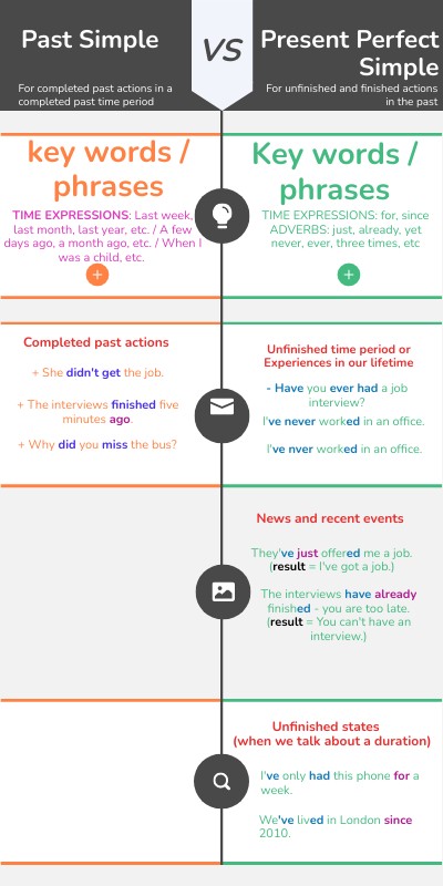 TIME EXPRESSIONS: for, since ADVERBS: just, already, yet never, ever, three times, etc