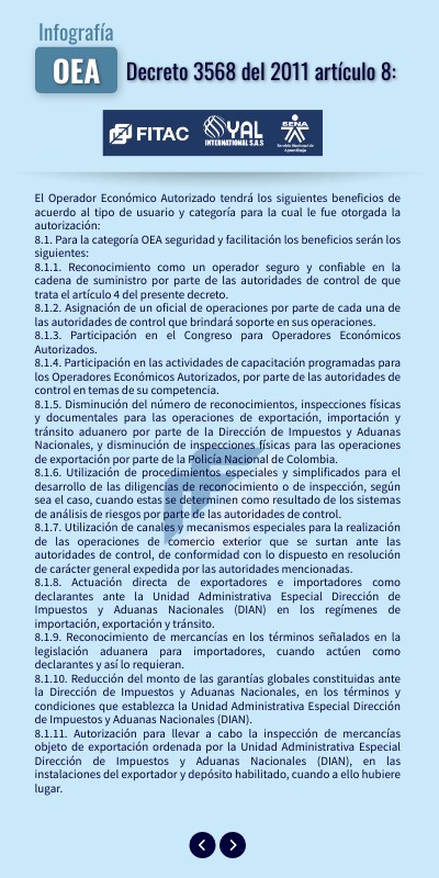 El Operador Económico Autorizado tendrá los siguientes beneficios de acuerdo al tipo de usuario y categoría para la cual le fue otorgada la autorización: 8.1. Para la categoría OEA seguridad y facilitación los beneficios serán los siguientes: 8.1.1. Reconocimiento como un operador seguro y confiable en la cadena de suministro por parte de las autoridades de control de que trata el artículo 4 del presente decreto. 8.1.2. Asignación de un oficial de operaciones por parte de cada una de las autoridades de control que brindará soporte en sus operaciones. 8.1.3. Participación en el Congreso para Operadores Económicos Autorizados. 8.1.4. Participación en las actividades de capacitación programadas para los Operadores Económicos Autorizados, por parte de las autoridades de control en temas de su competencia. 8.1.5. Disminución del número de reconocimientos, inspecciones físicas y documentales para las operaciones de exportación, importación y tránsito aduanero por parte de la Dirección de Impuestos y Aduanas Nacionales, y disminución de inspecciones físicas para las operaciones de exportación por parte de la Policía Nacional de Colombia. 8.1.6. Utilización de procedimientos especiales y simplificados para el desarrollo de las diligencias de reconocimiento o de inspección, según sea el caso, cuando estas se determinen como resultado de los sistemas de análisis de riesgos por parte de las autoridades de control. 8.1.7. Utilización de canales y mecanismos especiales para la realización de las operaciones de comercio exterior que se surtan ante las autoridades de control, de conformidad con lo dispuesto en resolución de carácter general expedida por las autoridades mencionadas. 8.1.8. Actuación directa de exportadores e importadores como declarantes ante la Unidad Administrativa Especial Dirección de Impuestos y Aduanas Nacionales (DIAN) en los regímenes de importación, exportación y tránsito. 8.1.9. Reconocimiento de mercancías en los términos señalados en la legislación aduanera para importadores, cuando actúen como declarantes y así lo requieran. 8.1.10. Reducción del monto de las garantías globales constituidas ante la Dirección de Impuestos y Aduanas Nacionales, en los términos y condiciones que establezca la Unidad Administrativa Especial Dirección de Impuestos y Aduanas Nacionales (DIAN). 8.1.11. Autorización para llevar a cabo la inspección de mercancías objeto de exportación ordenada por la Unidad Administrativa Especial Dirección de Impuestos y Aduanas Nacionales (DIAN), en las instalaciones del exportador y depósito habilitado, cuando a ello hubiere lugar.