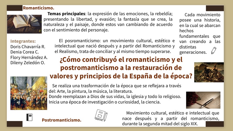 ¿Cómo contribuyó el romanticismo y el postromanticismo a la restauración de valores y principios de la España de la época?