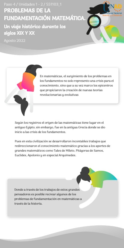 Según los registros el origen de las matemáticas tiene lugar en el antiguo Egipto; sin embargo, fue en la antigua Grecia donde se dio inicio a las crisis de los fundamentos. Pues en esta civilización se desarrollaron incontables trabajos que redireccionaron el conocimiento matemático gracias a los aportes de grandes matemáticos como Tales de Mileto, Pitágoras de Samos, Euclides, Apolonio y en especial Arquímedes.