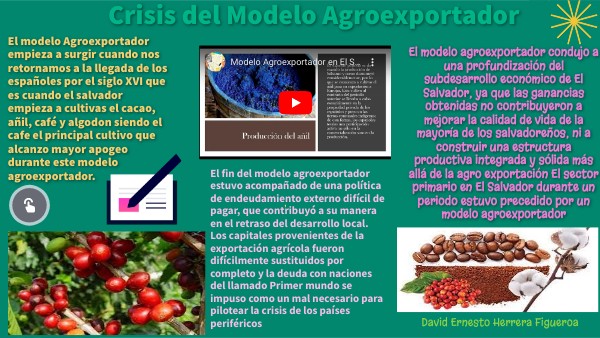 El modelo Agroexportador empieza a surgir cuando nos retornamos a la llegada de los españoles por el siglo XVI que es cuando el salvador empieza a cultivas el cacao, añil, café y algodon siendo el cafe el principal cultivo que alcanzo mayor apogeo durante este modelo agroexportador.