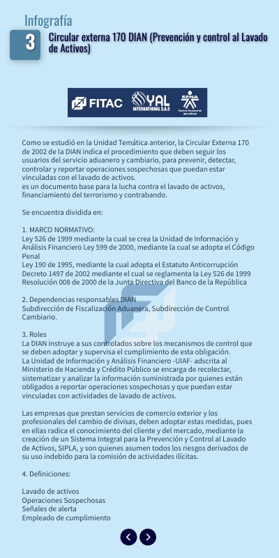 Como se estudió en la Unidad Temática anterior, la Circular Externa 170 de 2002 de la DIAN indica el procedimiento que deben seguir los usuarios del servicio aduanero y cambiario, para prevenir, detectar, controlar y reportar operaciones sospechosas que puedan estar vinculadas con el lavado de activos. es un documento base para la lucha contra el lavado de activos, financiamiento del terrorismo y contrabando. Se encuentra dividida en: 1. MARCO NORMATIVO: Ley 526 de 1999 mediante la cual se crea la Unidad de Información y Análisis Financiero Ley 599 de 2000, mediante la cual se adopta el Código Penal Ley 190 de 1995, mediante la cual adopta el Estatuto Anticorrupción Decreto 1497 de 2002 mediante el cual se reglamenta la Ley 526 de 1999 Resolución 008 de 2000 de la Junta Directiva del Banco de la República 2. Dependencias responsables DIAN Subdirección de Fiscalización Aduanera, Subdirección de Control Cambiario. 3. Roles La DIAN instruye a sus controlados sobre los mecanismos de control que se deben adoptar y supervisa el cumplimiento de esta obligación. La Unidad de Información y Análisis Financiero -UIAF- adscrita al Ministerio de Hacienda y Crédito Público se encarga de recolectar, sistematizar y analizar la información suministrada por quienes están obligados a reportar operaciones sospechosas y que puedan estar vinculadas con actividades de lavado de activos. Las empresas que prestan servicios de comercio exterior y los profesionales del cambio de divisas, deben adoptar estas medidas, pues en ellas radica el conocimiento del cliente y del mercado, mediante la creación de un Sistema Integral para la Prevención y Control al Lavado de Activos, SIPLA, y son quienes asumen todos los riesgos derivados de su uso indebido para la comisión de actividades ilícitas. 4. Definiciones: Lavado de activos Operaciones Sospechosas Señales de alerta Empleado de cumplimiento