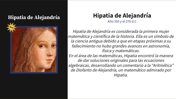 Hipatia de Alejandría es considerada la primera mujer matemática y científica de la historia. Ella es un símbolo de la ciencia antigua debido a que en etapas próximas a su fallecimiento no hubo grandes avances en astronomía, física y matemáticas. En el área de las matemáticas, Hipatia encontró la manera de dar soluciones originales para las ecuaciones algebraicas, desarrollando un comentario a la “Aritmética” de Diofanto de Alejandría, un matemático admirado por Hipatia.