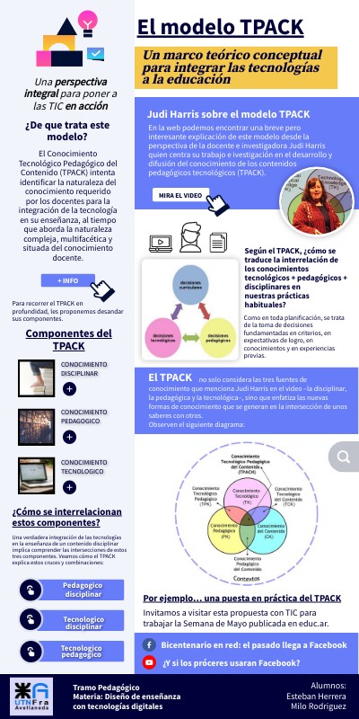 En la web podemos encontrar una breve pero interesante explicación de este modelo desde la perspectiva de la docente e investigadora Judi Harris quien centra su trabajo e ivestigación en el desarrollo y difusión del conocimiento de los contenidos pedagógicos tecnológicos (TPACK).