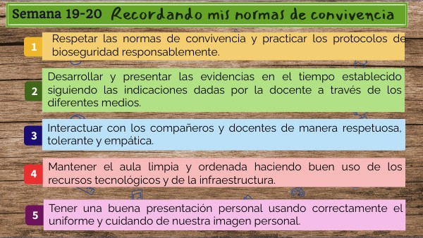 Sobre los bienes de la IE: - Mantener limpia la IE. - Mantener la limpieza del aula. - Cuidar las áreas verdes de la IE. Sobre su salud personal - No consumir drogas ni alcohol. - Cuidar su higiene personal. - Lavarse las manos adecuadamente tras usar los servicios higiénicos.