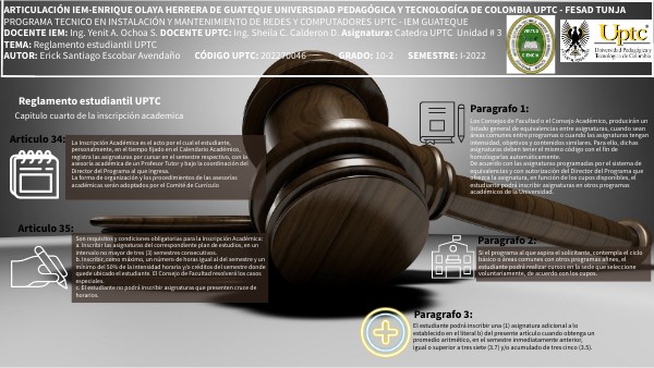 ARTICULACIÓN IEM-ENRIQUE OLAYA HERRERA DE GUATEQUE UNIVERSIDAD PEDAGÓGICA Y TECNOLOGÍCA DE COLOMBIA UPTC - FESAD TUNJA PROGRAMA TECNICO EN INSTALACIÓN Y MANTENIMIENTO DE REDES Y COMPUTADORES UPTC - IEM GUATEQUE DOCENTE IEM: Ing. Yenit A. Ochoa S. DOCENTE UPTC: Ing. Sheila C. Calderon D. Asignatura: Catedra UPTC Unidad # 3 TEMA: Reglamento estudiantil UPTC AUTOR: Erick Santiago Escobar Avendaño CÓDIGO UPTC: 202270046 GRADO: 10-2 SEMESTRE: I-2022