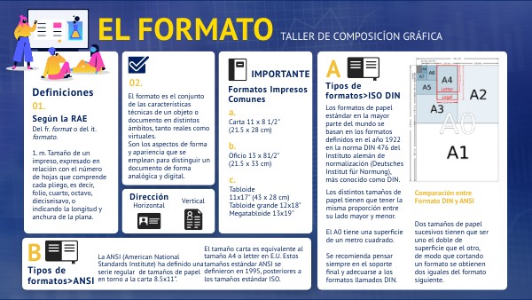 Los distintos tamaños de papel tienen que tener la misma proporción entre su lado mayor y menor. El A0 tiene una superficie de un metro cuadrado. Se recomienda pensar siempre en el soporte final y adecuarse a los formatos llamados DIN.