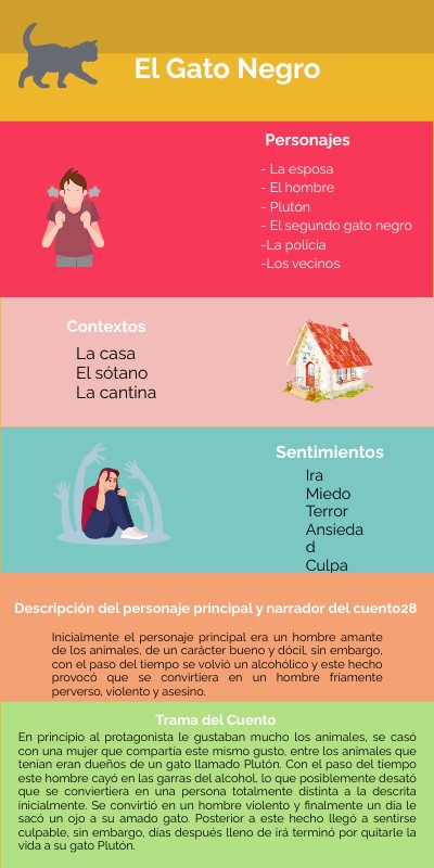 En principio al protagonista le gustaban mucho los animales, se casó con una mujer que compartía este mismo gusto, entre los animales que tenían eran dueños de un gato llamado Plutón. Con el paso del tiempo este hombre cayó en las garras del alcohol, lo que posiblemente desató que se conviertiera en una persona totalmente distinta a la descrita inicialmente. Se convirtió en un hombre violento y finalmente un día le sacó un ojo a su amado gato. Posterior a este hecho llegó a sentirse culpable, sin embargo, días después lleno de irá terminó por quitarle la vida a su gato Plutón.