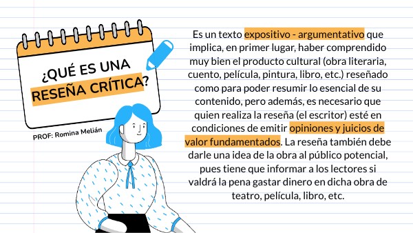 Es un texto expositivo - argumentativo que implica, en primer lugar, haber comprendido muy bien el producto cultural (obra literaria, cuento, película, pintura, libro, etc.) reseñado como para poder resumir lo esencial de su contenido, pero además, es necesario que quien realiza la reseña (el escritor) esté en condiciones de emitir opiniones y juicios de valor fundamentados. La reseña también debe darle una idea de la obra al público potencial, pues tiene que informar a los lectores si valdrá la pena gastar dinero en dicho producto cultural.