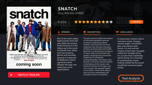 In many ways, Snatch is like a Tarantino movie. Strange camera angles, convoluted plot, and violence with humor, it's rock and roll movies at their best. Savagely violent but savagely funny, it's a movie that is definitely worth seeing. It's a triumph of contemporary movie-making, backed up by a great soundtrack and some great acting.