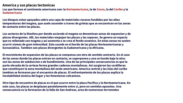 Las que forman el continente americano son: la Norteamericana, la de Cocos, la del Caribe y la SudamericanaLos bloques estan apoyados sobre una capa de materiales rocosos fundidos por las altas temperaturas del magma, que suele ascender a traves de grietas que se encuentran en las zonas de contacto entre las placas.Los sectores de la litosfera por donde asciende el magma se denominan zonas de expansion y de placas divergentes. Alli, los materiales empujan las placas y las separan. Se genera un espacio que es rellenado con magma y asi aumenta o se crea el fondo oceanico. En estas zonas no suelen ocurrir sismos de gran intensidad. Esto sucede en el borde de las placas Norteamericanas y Euroasiatica. Tambien son placas divergentes la Sudamericana y la Africana.El movimiento de expansion de las placas se compensa con otro de sentido contrario. En el caso de las zonas donde las placas entran en contacto, se superponen y una se hunde bajo la otra: son las zonas de subduccion o de hundimiento. Una de las principales consecuencias es que la parte elevada de la corteza forma grandes cadenas montañosas. Asi surgieron las cordilleras que constituyen la zona montañosa del oeste americano. America central y las islas del caribe tambien se formaron por el encuentro de placas. El enfrentamiento de las placas explica la inestabilidad sismica del lugar y los fenomenos volcanicos.Otro tipo de encuentro de placas es el que ocurre entre la placa Pacifica y la Norteamericana. En este caso, las placas se desplazan paralelamente entre si, pero en sentidos opuestos. Una consecuencia es la formacion de la falla de San Andreas, area de numerosos terremotos