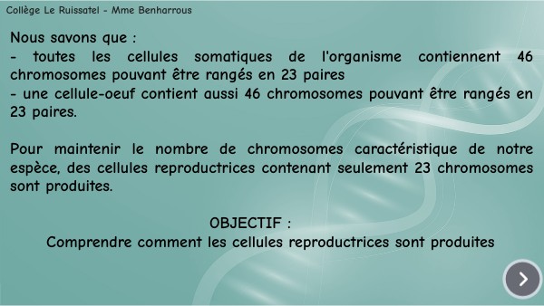Nous savons que :- toutes les cellules somatiques de l'organisme contiennent 46 chromosomes pouvant être rangés en 23 paires - une cellule-oeuf contient aussi 46 chromosomes pouvant être rangés en 23 paires. Pour maintenir le nombre de chromosomes caractéristique de notre espèce, des cellules reproductrices contenant seulement 23 chromosomes sont produites. OBJECTIF :Comprendre comment les cellules reproductrices sont produites