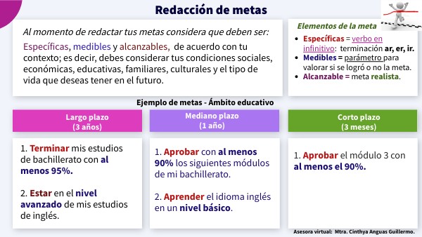 Específicas, medibles y alcanzables, de acuerdo con tu contexto; es decir, debes considerar tus condiciones sociales, económicas, educativas, familiares, culturales y el tipo de vida que deseas tener en el futuro.