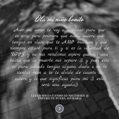 Espero mucho poder ayudar con algo, te amo y quiero que eso siempre lo tengas en claro de que eres muy importante para mi. Y como te he dicho eres mi FELICIDAD Y MI DEBILIDAD, TE AMO MI NIÑO BONITO CADA DÍA MAS Y MÁS. y siempre voy a tratar de ayudarte en lo que pueda. Te amo ♡.