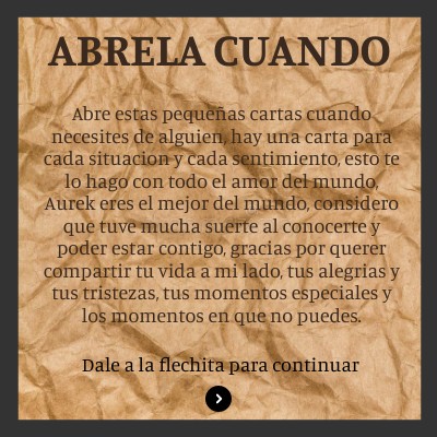 Abre estas pequeñas cartas cuando necesites de alguien, hay una carta para cada situacion y cada sentimiento, esto te lo hago con todo el amor del mundo, Aurek eres el mejor del mundo, considero que tuve mucha suerte al conocerte y poder estar contigo, gracias por querer compartir tu vida a mi lado, tus alegrias y tus tristezas, tus momentos especiales y los momentos en que no puedes.