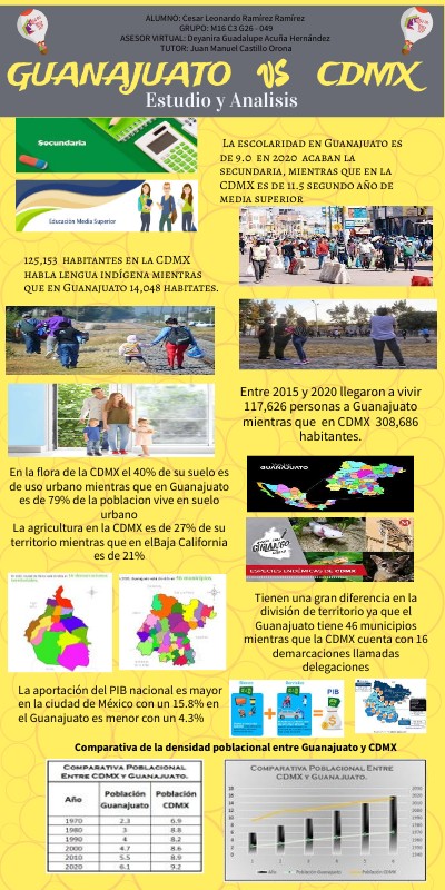 La escolaridad en Guanajuato es de 9.0 en 2020 acaban la secundaria, mientras que en la CDMX es de 11.5 segundo año de media superior