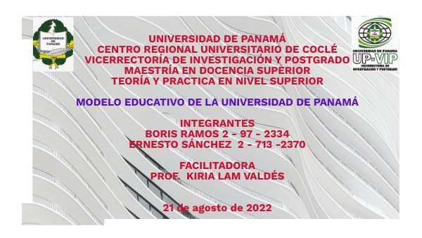 UNIVERSIDAD DE PANAMÁ CENTRO REGIONAL UNIVERSITARIO DE COCLÉ VICERRECTORÍA DE INVESTIGACIÓN Y POSTGRADO MAESTRÍA EN DOCENCIA SUPERIOR TEORÍA Y PRACTICA EN NIVEL SUPERIOR MODELO EDUCATIVO DE LA UNIVERSIDAD DE PANAMÁ INTEGRANTES BORIS RAMOS 2 - 97 - 2334 ERNESTO SÁNCHEZ 2 - 713 -2370 FACILITADORA PROF. KIRIA LAM VALDÉS 21 de agosto de 2022