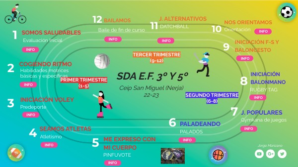 En esta unidad el alumnado realizará una secuenciación en la práctica de la orientación. El alumnado aprenderá a orientarse en el espacio, partiendo desde un lugar conocido y seguro, en espacios pequeños, como es el aula, pasando por una orientación en los diferentes patios del centro escolar para terminar intentando superar el reto, haciendo una orientación por equipos en un parque cercano, el Parque Verano Azul de Nerja. Para superar esta unidad los niños y niñas deberán superar el siguiente reto: RETO: CONSIGUE ORIENTARTE EN TRES LUGARES DIFERENTES. También se fomentará la utilización de recursos digitales con la visualización de páginas web y del genially de las unidades del curso. La Unidad terminará con una Orientación en el Parque Verano Azul por equipos, con la colaboración de las familias, muy necesarias en esta Situación de Aprendizaje. Se proponen tareas y actividades a través de juegos y de ejercicios que nos permitan mejorar las habilidades y destrezas necesarias para jugar y divertirse.