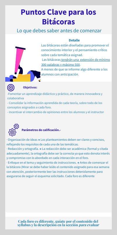 · Organización de ideas → Los planteamientos deben ser claros y concisos, reflejando los requisitos de cada una de las temáticas. · Redacción y ortografía. → La redacción debe ser académica (formal y citada adecuadamente), la ortografía debe ser la correcta ya que esto denota interés y compromiso con lo abordado en cada bitácora. · Enfoque en el tema y seguimiento de instrucciones. → Antes de comenzar la bitácora (Se debe haber leído el contenido asignado para esas semanas con atención, posteriormente leer las instrucciones detenidamente para asegurarse de seguir el esquema solicitado. Cada bitácora es diferente. · Cantidad de palabras → Se debe cumplir el mínimo y no exceder el máximo. Los títulos, subtítulos, instrucciones y similares no cuentan como parte del conteo de las palabras.