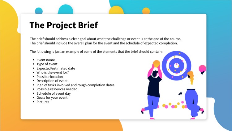 The brief should address a clear goal about what the challenge or event is at the end of the course. The brief should include the overall plan for the event and the schedule of expected completion. The following is just an example of some of the elements that the brief should contain: