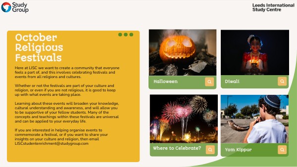 Here at LISC we want to create a community that everyone feels a part of, and this involves celebrating festivals and events from all religions and cultures. Whether or not the festivals are part of your culture and religion, or even if you are not religious, it is good to keep up with what events are taking place. Learning about these events will broaden your knowledge, cultural understanding and awareness, and will allow you to be supportive of your fellow students. Many of the concepts and teachings within these festivals are universal and can be applied to your everyday life. If you are interested in helping organise events to commemorate a festival, or if you want to share your insights on your culture and religion, then email LISCstudentenrichment@studygroup.com