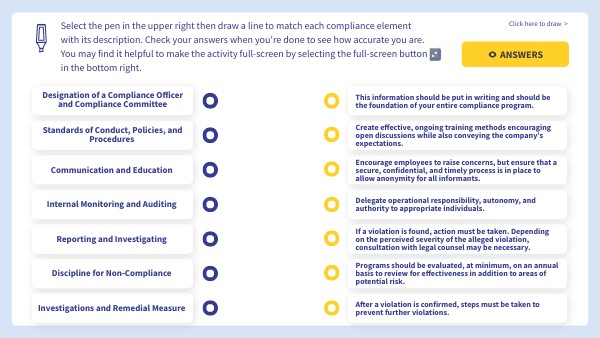 Select the pen in the upper right then draw a line to match each compliance element with its description. Check your answers when you're done to see how accurate you are.You may find it helpful to make the activity full-screen by selecting the full-screen button in the bottom right.