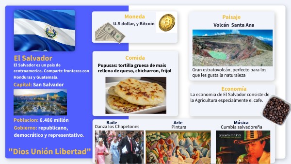 Vamos a El Salvador! la capital, San Salvador es la cuidad mas antigua de Centroamérica, fue fundada en 1524. Aunque El Salvador es conocido como “El Pulgarcito de América” por ser el país más pequeño del continente, es hermoso y tiene mucho que ofrecer. Si te encanta la naturaleza y escalar entonces tienes que visitar el enorme Volcan Santa Ana. La playa de El Salvador "El tunco" tiene la agua perfecta para hacer surf y pasar un buen tiempo. También despues de una deliciosa cena comiendo el platillo tradicional de El Salvador que son las pupusas, puedes ir al museo de arte para ver la pinturas unicas y te quedaras sorprendido de tanta belleza. Por último, la moneda de El Salvador es el dollar de Estados Unidos asi que no tendras complicaciones con eso.