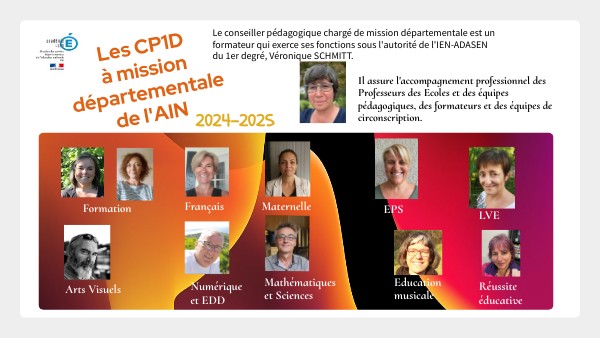 Il assure l'accompagnement professionnel des Professeurs des Ecoles et des équipes pédagogiques, des formateurs et des équipes de circonscription.