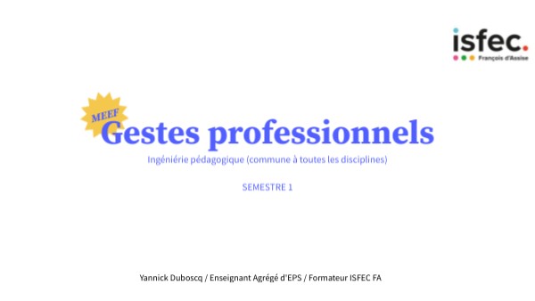 Informations importantes sur l'organisation de l'ingéniérie pédagogique : Des séances "gestes professionnels" (communes à toutes les discplines) Des séances portées par la discipline elle-même. Partiels : Semestre 1 en "gestes professionnels" / Semestre 2 et Semestre 3 en ingé péda de la discipline. Fonctionnement : Sur it's learning et Ypareo. Asynchrone ludique entre deux séances. Temporalité du cours "Gestes professionnels"à l'échelle du Master MEEF : Semestre 1 : les gestes professionnels pour construire et animer le cours (préoccupations des enseignants, étayage, les postures de l'enseignant, le pilotage d'une situation d'apprentissage). Semestre 2 : les gestes professionnels pour gérer le groupe classe (climat, autorité) Semestre 3 : les gestes professionnels favorisant l'engagement des élèves (motivation, différenciation, les différentes évaluations).