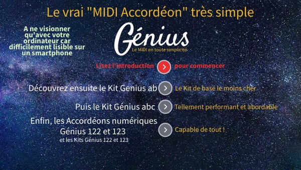 Bravo pour votre envie d'acquérir un instrument MIDIGénius * et merci de nous faire confiance pour vous aider à réaliservos projets musicaux.L'électronique Génius a été conçue afin que tous les accordéonistes puissent réaliser, très simplement, leurs rêves. Vous rêviez d’un tel compagnon ? Parmi nos modèles Il y en a certainement un conçu pour vous, vous qui n'êtes pas informaticien * créations JBMpro