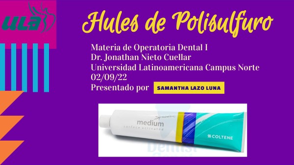 Los hules de polisulfuro son materiales denatales que ayudan en la toma de impresiones, las impresiones quedan con muy buenos detalles y es por eso que su uso es importante en el campo odontológico. Son elastómeros los cuáles se componen de una pasta base y una pasta reactora, su reacción es mediante la polimerización.