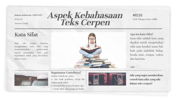 Pada teks cerpen biasanya menggunakan kata sifat yang mendeskripsikan pelaku/tokoh seperti penampilan fisik juga kepribadian tokoh yang diceritakan dalam cerpen.