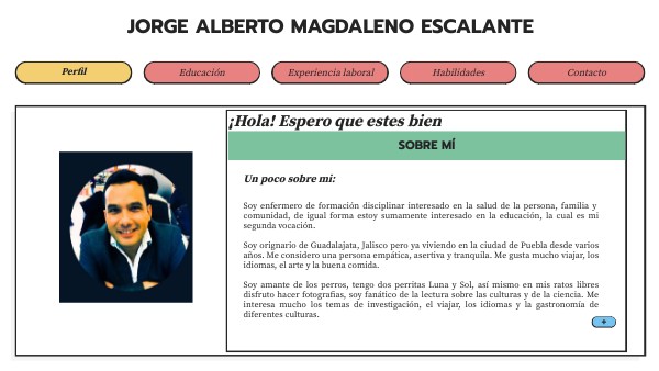 Soy enfermero de formación disciplinar interesado en la salud de la persona, familia y comunidad, de igual forma estoy sumamente interesado en la educación, la cual es mi segunda vocación. Soy orignario de Guadalajata, Jalisco pero ya viviendo en la ciudad de Puebla desde varios años. Me considero una persona empática, asertiva y tranquila. Me gusta mucho viajar, los idiomas, el arte y la buena comida. Soy amante de los perros, tengo dos perritas Luna y Sol, así mismo en mis ratos libres disfruto hacer fotografias, soy fanático de la lectura sobre las culturas y de la ciencia. Me interesa mucho los temas de investigación, el viajar, los idiomas y la gastronomía de diferentes culturas.