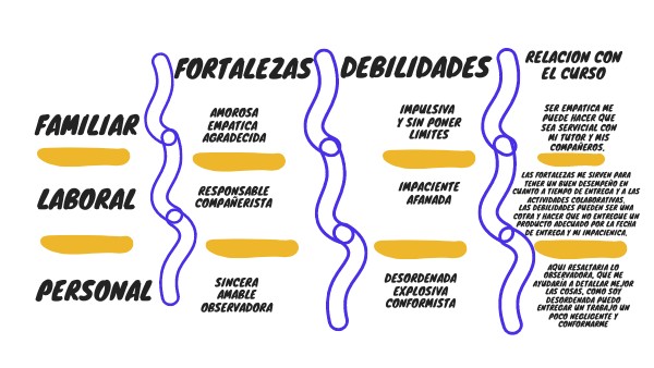 Las fortalezas me sirven para tener un buen desempeño en cuanto a tiempo de entrega y a las actividades colaborativas. Las debilidades pueden ser una cotra y hacer que no entregue un producto adecuado por la fecha de entrega y mi impacienica.